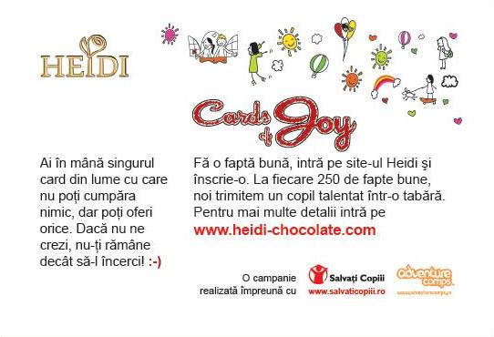 Despre ce este vorba? Esti incurajat sa faci o fapta buna, pe care sa o povestesti pe site-ul Cards of Joy. Vei primi un cod unic, pe care il poti transmite daca vrei prietenilor tai, pentru a face impreuna un lant de fapte bune. La fiecare 250 de fapte bune inregistrate, Heidi trimite un copil talentat, dar sarac, intr-o tabara de aventura si creatie.