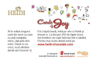 Asta am scris pe Cards of Joy, incercand sa rezum cat mai bine ideea acestei campanii de la Heidi. Desi Heidi este clientul agentiei pentru care lucrez, faptul ca va povestesc despre aceasta campanie nu face parte din sarcinile mele de serviciu pentru azi. 🙂 Va povestesc despre Cards of Joy pentru ca e un proiect frumos in care cred.